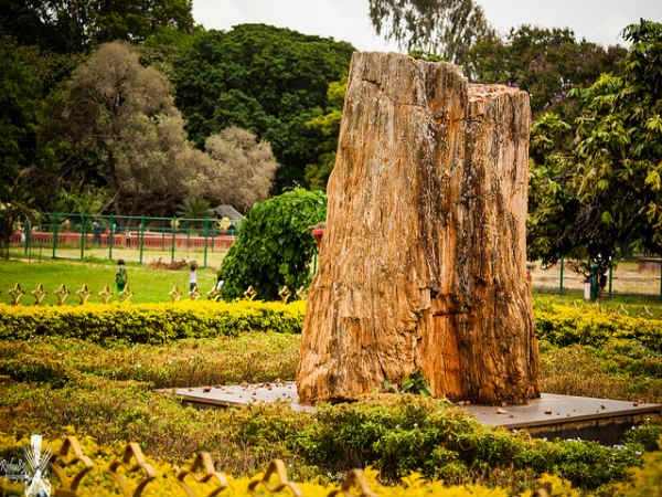 ಲಾಲ್ ಬಾಗ್ ಉದ್ಯಾನದಲ್ಲಿರುವ ಇಂಗಾಲೀಕರಿಸಿದ ಸುಮಾರು 20 ಮಿಲಿಯನ್ ವರ್ಷಗಳಷ್ಟು ಪುರಾತನವಾದ ಒಂದು ಮರದ ಕಾಂಡ.